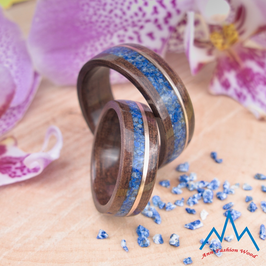 - pierwsze zdjęcie: obrączka z brązowego drewna hebanu makassar ozdobiona granatowo-niebieskim lapis lazuli i paskiem brązu cynowego. Obrączki o szerokości 6 i 8 mm.