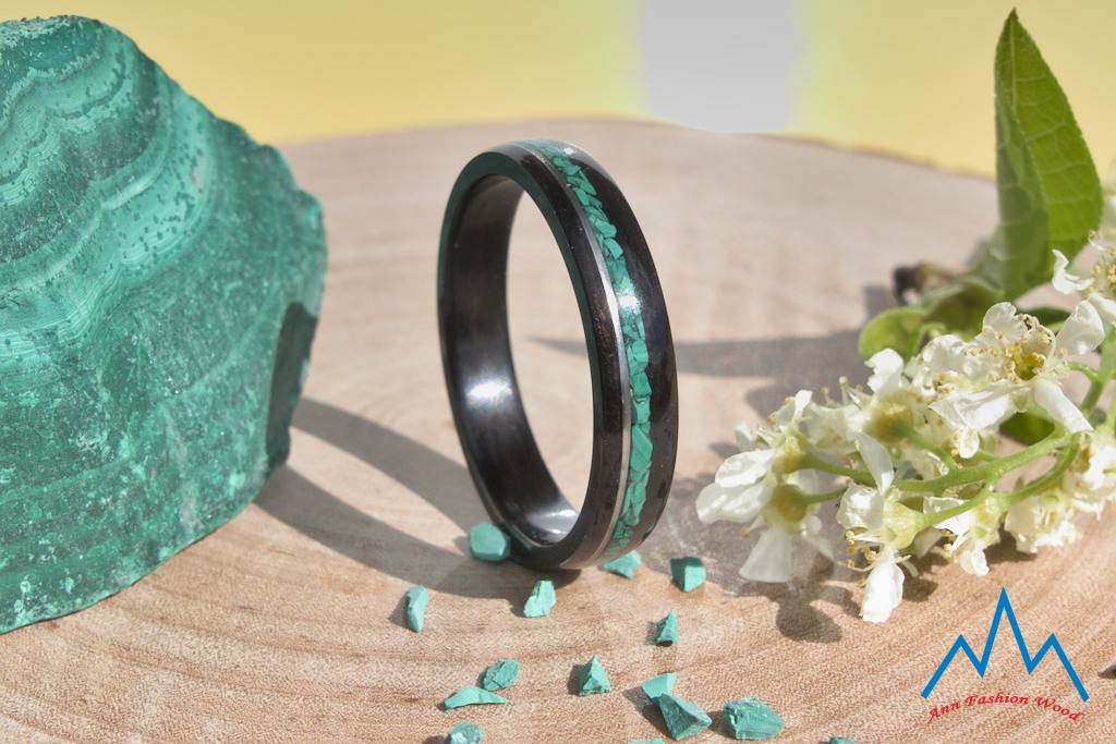 - drugie zdjęcie: obrączka z czarnego drewna hebanu makassar ozdobiona zielonym malachitem i paskiem ze stali szlachetnej 316L. Obrączka o szerokości 4 mm.