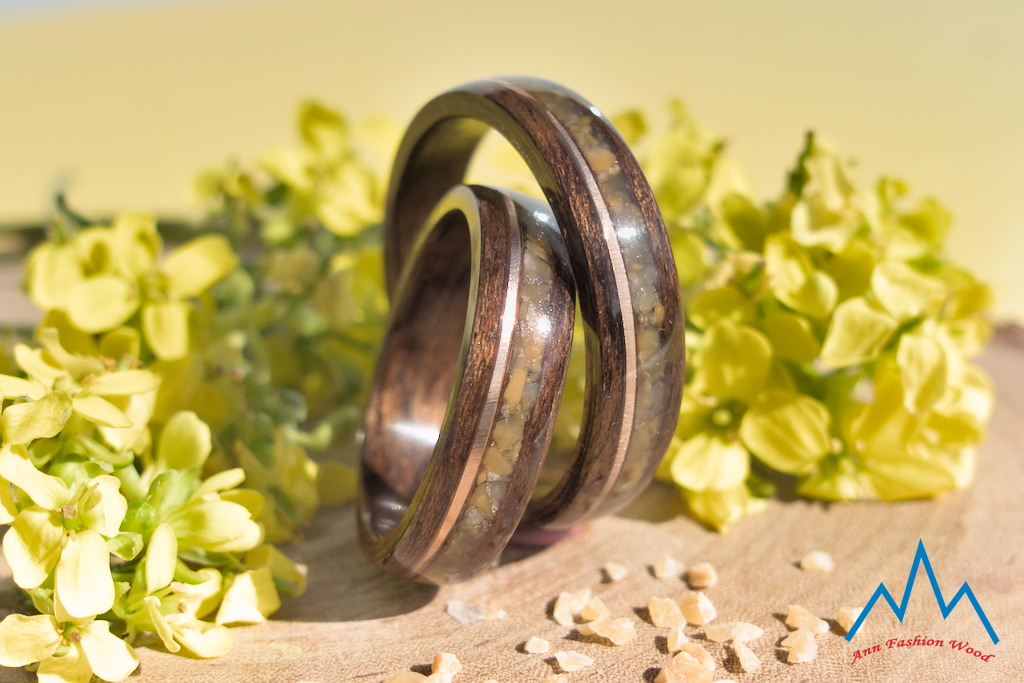 - czwarte zdjęcie: obrączka ze złoto-brązowego drewna palisander madagaskarski ozdobione blado-niebieskim celestynem oraz brązem cynowym. Obrączki o szerokości 6 mm.