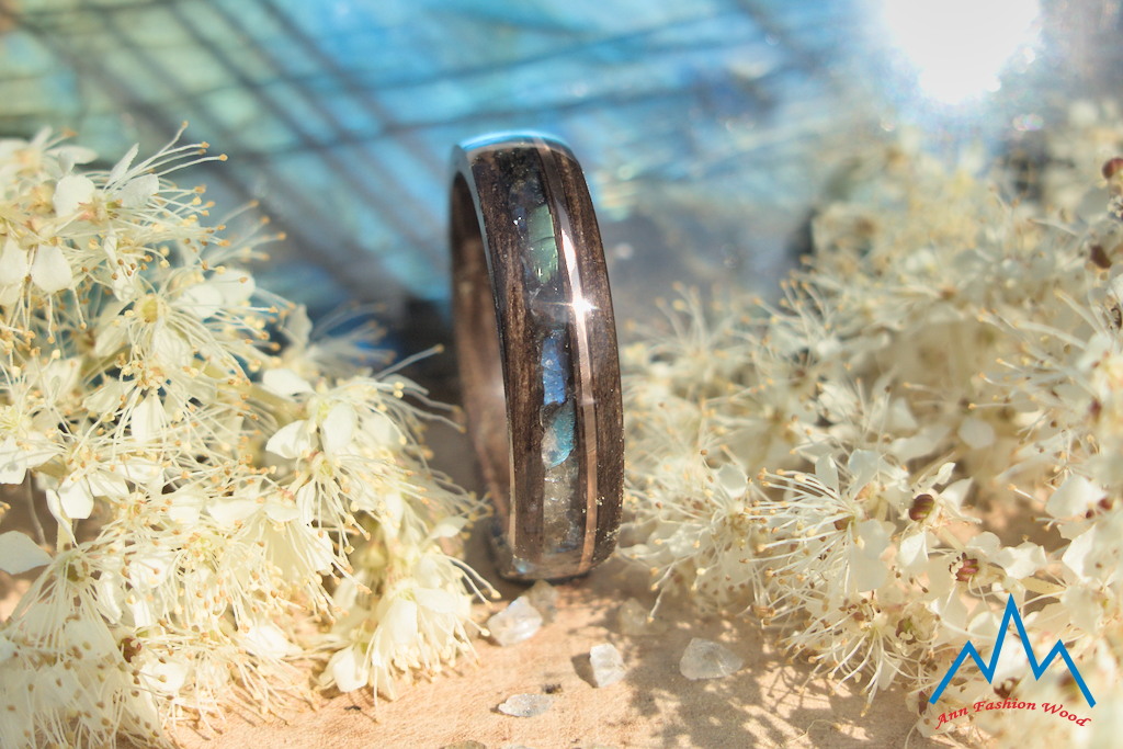 - piąte zdjęcie: obrączka z brązowo-czarnego drewna dębu wędzonego ozdobiona wielobarwnym labradorytem i stalą szlachetną 316L. Obrączka o szerokości 5 mm.