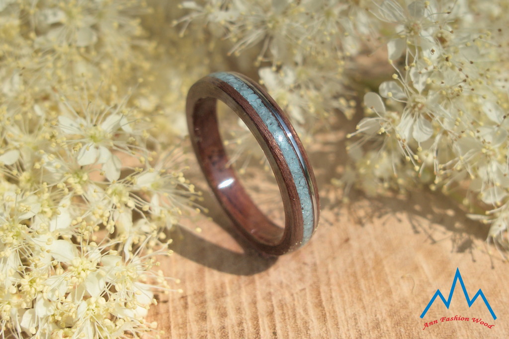 - szóste zdjęcie: obrączka z brązowego drewna hebanu makassar ozdobiona niebieskim turkusem i stalą szlachetną 316L. Obrączka o szerokości 3 mm.